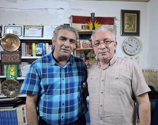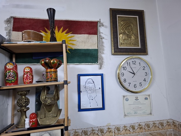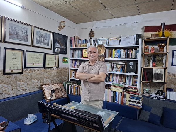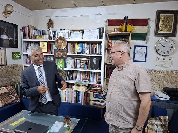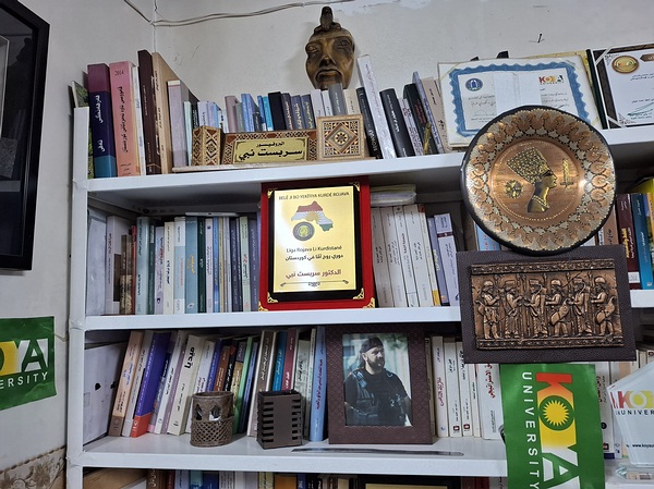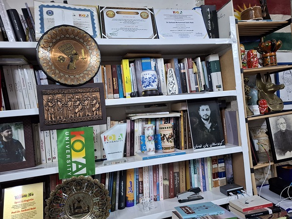 اللقاء لم يكن في قاعة احتفالية رسمية، بل في فضاء أكثر حميمية ودفئا؛ داخل مكتبة صغيرة المساحة، كبيرة بما تحمله من معنى وقيمة، تحتضنها دار الدكتور في هولير. مكتبة ضيقة بجدرانها لكنها مترامية بالمعرفة؛ رفوفها تتكدس بكتب قيمة وشهادات عليا، وتزينها دروع تقدير وبطاقات تكريم من مؤسسات وهيئات رسمية وأكاديمية عديدة. على جدرانها صور عائلية نابضة بالحياة، لكل منها قصة وذكرى، من بينها صورة لشقيقه الشهيد يوسف، وصور أطفاله في مراحل عمرية مختلفة، شاهدة على رحلة شخصية موازية لرحلة نضال شعب بأكمله.