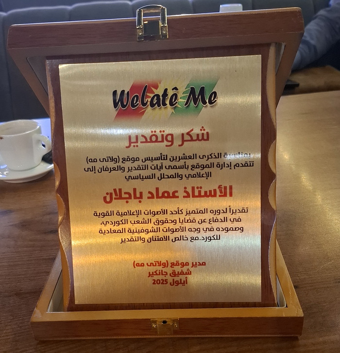 مدير موقع “ولاتي مه” أشاد خلال التكريم بدور باجلان، معتبرا أن منحه درع التكريم في هذه المناسبة الخاصة يأتي “تقديرا لمواقفه الوطنية والإنسانية، وإسهاماته في تعزيز الوعي السياسي والإعلامي الكردي”.