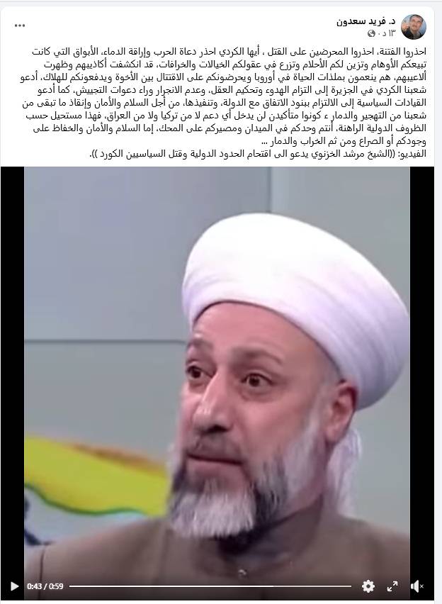 الفيديو: ((الشيخ مرشد الخزنوي يدعو الى اقتحام الحدود الدولية وقتل السياسيين الكورد )):