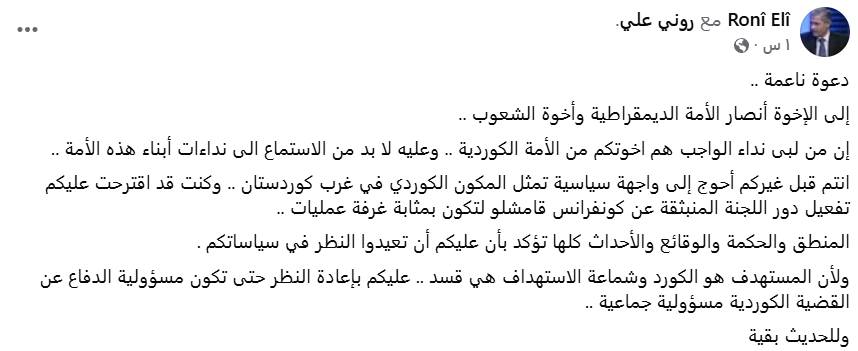 انتم قبل غيركم أحوج إلى واجهة سياسية تمثل المكون الكوردي في غرب كوردستان .. وكنت قد اقترحت عليكم تفعيل دور اللجنة المنبثقة عن كونفرانس قامشلو لتكون بمثابة غرفة عمليات ..