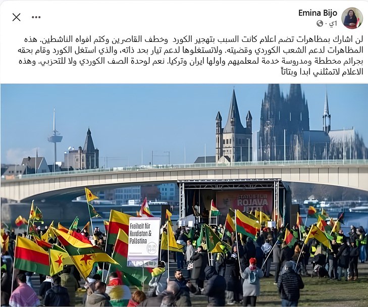 لن اشارك بمظاهرات تضم اعلام كانت السبب بتهجير الكورد وخطف القاصرين وكتم افواه الناشطين. هذه المظاهرات لدعم الشعب الكوردي وقضيته. ولاتستغلوها لدعم تيار بحد ذاته، والذي استغل الكورد وقام بحقه بجرائم مخططة ومدروسة خدمة لمعلميهم واولها ايران وتركيا. نعم لوحدة الصف الكوردي ولا للتحزبي. وهذه الاعلام لاتمثلني ابدا وبتاتاً