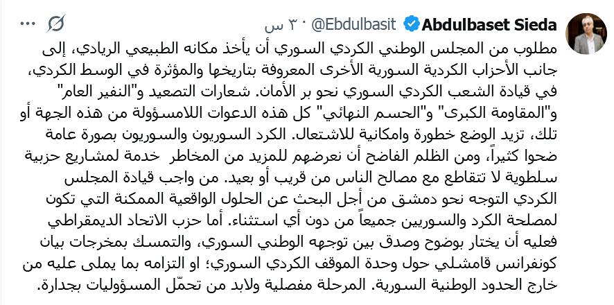 مطلوب من المجلس الوطني الكردي السوري أن يأخذ مكانه الطبيعي الريادي، إلى جانب الأحزاب الكردية السورية الأخرى المعروفة بتاريخها والمؤثرة في الوسط الكردي، في قيادة الشعب الكردي السوري نحو بر الأمان. شعارات التصعيد و”النفير العام” و”المقاومة الكبرى” و”الحسم النهائي” كل هذه الدعوات اللامسؤولة من هذه الجهة أو تلك، تزيد الوضع خطورة وامكانية للاشتعال. الكرد السوريون والسوريون بصورة عامة ضحوا كثيراً، ومن الظلم الفاضح أن نعرضهم للمزيد من المخاطر خدمة لمشاريع حزبية سلطوية لا تتقاطع مع مصالح الناس من قريب أو بعيد. من واجب قيادة المجلس الكردي التوجه نحو دمشق من أجل البحث عن الحلول الواقعية الممكنة التي تكون لمصلحة الكرد والسوريين جميعاً من دون أي استثناء. أما حزب الاتحاد الديمقراطي فعليه أن يختار بوضوح وصدق بين توجهه الوطني السوري، والتمسك بمخرجات بيان كونفرانس قامشلي حول وحدة الموقف الكردي السوري؛ او التزامه بما يملى عليه من خارج الحدود الوطنية السورية. المرحلة مفصلية ولابد من تحمّل المسؤوليات بجدارة.