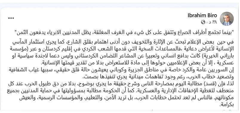 إن السوريين عامة والكرد خاصة في مناطق الجزيرة وكوباني يعيشون حالة قلق حقيقي، سببها غياب الشفافية وتصعيد خطاب الحرب، رغم وجود تفاهمات ميدانية يجري تنفيذها بصمت.