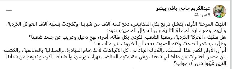 أم آن الأوان لكسر هذا الصمت، والتحرك الجاد في كل الاتجاهات لأخذ زمام المبادرة، والمطالبة بالمحاسبة، والكشف عن مصير العشرات من مناضلي شعبنا، وفي مقدمتهم المناضل بهزاد دورسن، والضباط الكرد، وغيرهم من شبابنا الذين غُيّبوا دون أي جواب؟