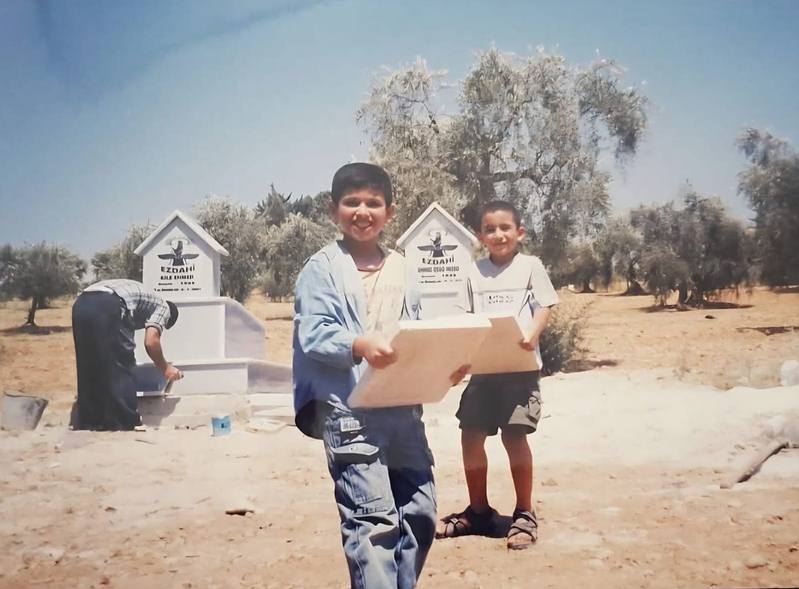 في صورةٍ شخصية تحمل وجع الذاكرة، يظهر ابني وابن أختي أثناء مشاركتهما الرمزية في بناء قبور جدهم وجدّتهم، كفعل احترام وارتباط بالأجيال السابقة.