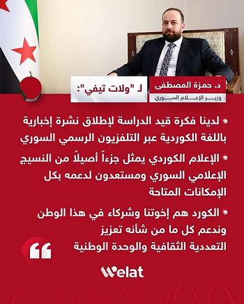 يأتي تصريح وزير الإعلام السوري الدكتور حمزة المصطفى حول الإعلام الكردي ومحاولتهم إطلاق نشرة إخبارية باللغة الكردية كخطوة تعكس حرص الدولة السورية على تعزيز الوحدة الوطنية وتأكيد دور جميع مكونات المجتمع السوري في بناء مستقبل مشترك. تصريحات الوزير التي أكد فيها أن “الكرد جزء لا يتجزأ من النسيج التاريخي والاجتماعي لسوريا” تبرز رؤية وطنية شاملة، تضع الحوار الوطني كأساس لمعالجة أي تحديات أو طموحات لمختلف المكونات السورية.