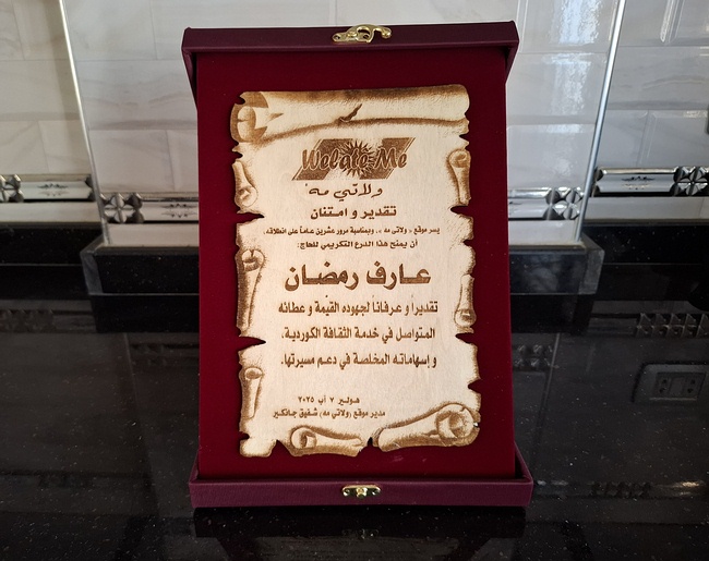 هولير (ولاتي مه) – خاص : بمناسبة الذكرى العشرين لتأسيس موقع “ولاتي مه”، كرمت إدارة الموقع الحاج عارف رمضان، مدير مؤسسة سما للثقافة والفنون، تقديرا لجهوده البارزة في خدمة الثقافة الكردية وتعزيز الحوار الثقافي.