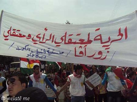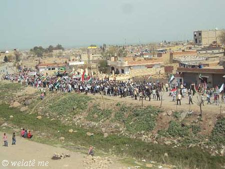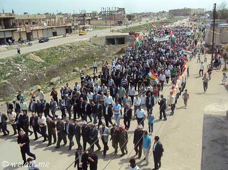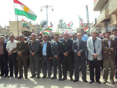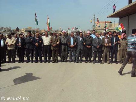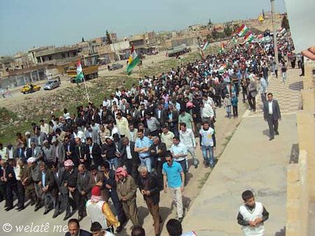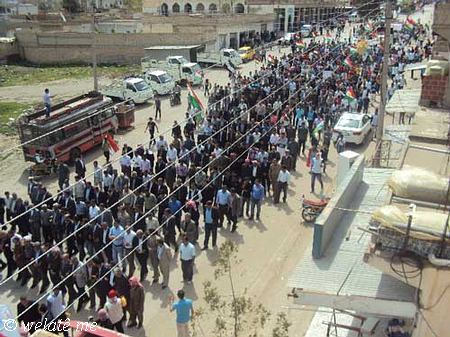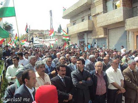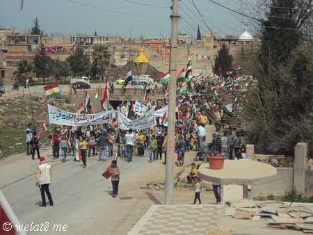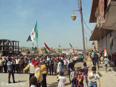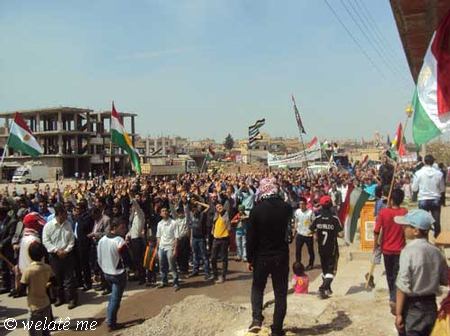 (ولاتي مه – خاص) بدعوة من المجلس المحلي في ديرك التابع للمجلس الوطني الكردي في سوريا ومساهمة فاعلة من التنسيقيات الشبابية والنشطاء في الحراك الجماهيري الشعبي ومشاركة كافة الفعاليات السياسية والثقافية ولاجتماعية والمهنية ونشاط ملحوظ للعنصر النسائي والأطفال خرجت مظاهرة حاشدة اليوم السبت المصادف 7/4/2012 , في البداية وبعد التجمع امام الجامع الكبير في ديرك, والوقوف دقيقة صمت على ارواح الشهداء والنشيد القومي (أي رقيب) انطلقت المظاهرة مرددة الشعارات المطالبة بالحرية والاعتراف الدستوري بحقوق الشعب الكردي القومية المشروعة في سوريا, ورفع المتظاهرون لافتات باسم المجلس الوطني الكردي والتنسيقيات الشبابية التي تدين موقف المعارضة في مؤتمر استنبول في اجتماعه الأخير اتجاه قضية شعبنا والتاكيد على عدم المساومة على حقوق الشعب الكردي و الاستمرار في التظاهر السلمي حتى إسقاط النظام الدكتاتوري القاتل لشعبه وإسقاط كل من يعمل على إقصاء الشعب الكردي الأصيل في سوريا.